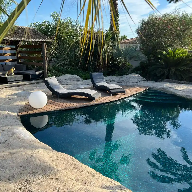 L’eau prend une teinte verte à turquoise naturelle, lumineuse et fraîche, notamment si l’on choisit des tons clairs. Elle évoque un lagon peu profond, à l’aspect doux et relaxant. Elle reflète bien la lumière et transmet une sensation d’eau propre, vivante et naturelle. Idéal pour les piscines entourées de végétation et les ambiances tropicales légères.