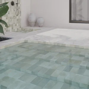 Le carrelage de piscine Bali ne se limite pas au fond et aux parois du bassin. Il permet de traiter l’ensemble de l’environnement de manière cohérente et esthétique. Utilisé dans le bassin, il influence directement la couleur de l’eau. Autour de la piscine, sur les plages, les bordures et les zones de transition, il crée une continuité visuelle très appréciée.