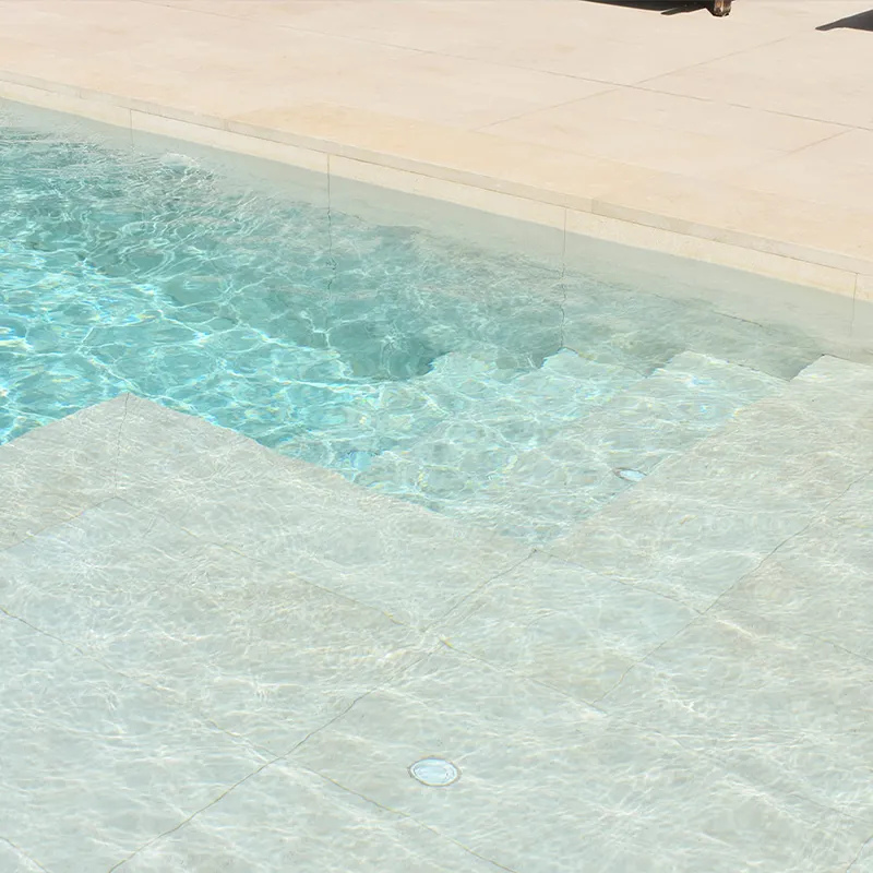 Dans un projet piscine, la sécurité est essentielle. Le carrelage de piscine Bali beige est disponible en finitions antidérapantes, spécialement recommandées pour les zones exposées à la circulation et à l’humidité permanente.