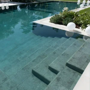 Le Bali green génère une eau de couleur vert émeraude à vert lagon plus profond, avec une forte présence visuelle. Selon la lumière, l’eau paraît plus claire et vibrante en journée, et plus intense et enveloppante le soir. Il apporte une forte connexion avec la nature et une sensation de profondeur très appréciée dans les piscines de type resort ou spa